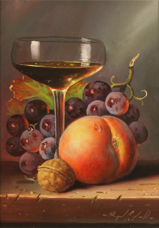 <p>An ode to glamorous years gone by, the champagne coupe softly bubbles. Alongside, a plump peach and single walnut await, each a delightful accompaniment.</p>