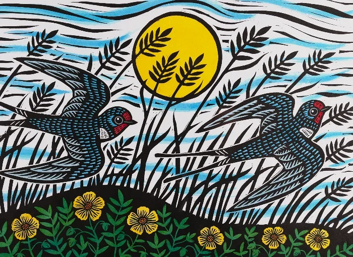 Gerard Hobson Original linocut print Alnmouth Swallows